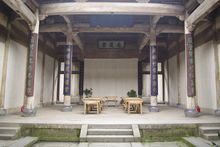 前廳是整幢房子中最精華的部分,大門后面聳立著一幅威儀的中門,在中門“!弊值纳戏,鑲有一幅木雕“百子鬧元宵”圖,圖上雕刻著100個小男孩過元宵鬧花燈時的情景,這正是古代“多子多福”傳統(tǒng)觀念的生動寫照,“百子鬧元宵”圖兩邊的“商”字斗拱上則分別雕有四出《三國演義》的戲文,斗拱的上方雕有“南、北”財神,“南、北”財神的上方是閣樓護(hù)板,在此,汪定貴設(shè)計了“漁、樵、耕、讀”四根木雕立柱,分別代表了古代的四種職業(yè)。