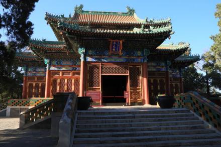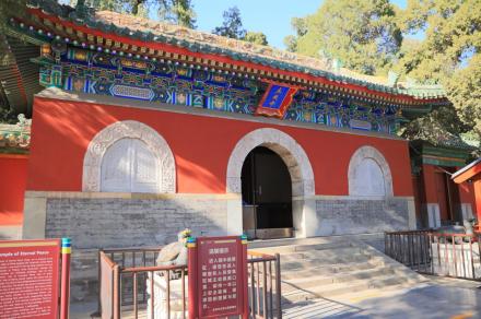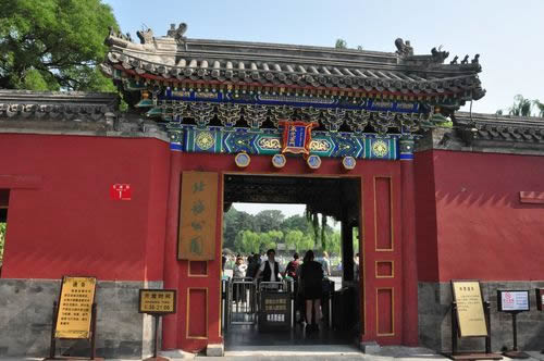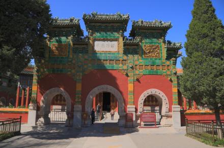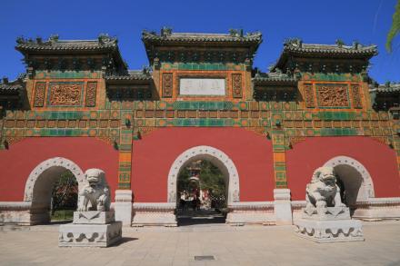 智珠殿,半月城位于瓊島東麓山腳下,座西面東與陟山橋相對(duì),建于乾隆十六年(1751年)。智珠殿建在半月城城臺(tái)上,紅墻綠瓦,四面有五個(gè)牌樓相對(duì),中軸對(duì)稱、布局別致是中國(guó)古建筑中比較少見(jiàn)的,殿內(nèi)原供奉文殊菩薩一尊。