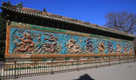 九龍壁是原大圓鏡智寶殿前的影壁,建于乾隆二十一年(1756年)。壁高5.96米,厚1.60米,長(zhǎng)25.52米。壁的兩面用七色琉璃磚瓦鑲砌而成。兩面各有九條彩色大蟠龍,飛騰戲珠于波濤云際之中。壁上共有大小蟠龍635條。中國(guó)現(xiàn)存三座古代九龍壁,唯獨(dú)這座是雙面壁。