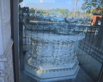 玉甕又稱“瀆山大玉海”,制作于至元二年(1265年)?诔蕶E圓形,通高70公分,周長(zhǎng)493公分,重約3500公斤,周身浮雕海龍、海馬、海豬、海犀等出沒(méi)于波濤之中,栩栩如生。元世祖忽必烈曾將玉甕放置瓊?cè)A島廣寒殿中,傳說(shuō)曾用以盛酒大宴群臣。明代廣寒殿倒塌,玉甕失落民間。清乾隆十年(1745年)發(fā)現(xiàn)后,乾隆皇帝“令以千金易之,置承光殿中”,乾隆十四年(1749年)建玉甕亭,將玉甕陳設(shè)于亭中配以漢白玉雕花石座,命翰林四十人,各賦詩(shī)一首,刻于亭柱之上。
