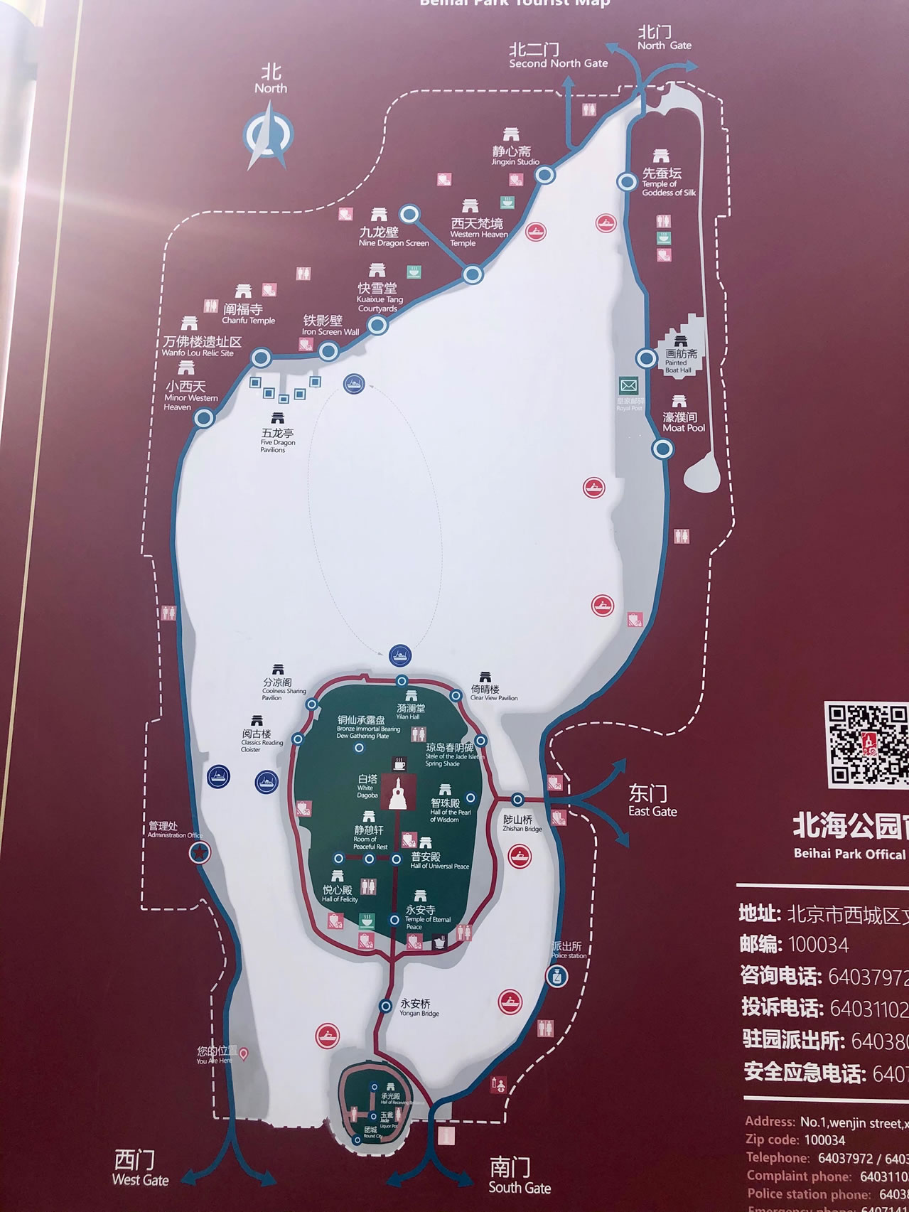 北海公園,位于北京市西城區(qū)文津街1號(hào),東鄰景山,南瀕中南海,北連什剎海,屬于中國(guó)古代皇家園林。全園占地69公頃(其中水面39公頃),主要由瓊?cè)A島、東岸和北岸景區(qū)組成。瓊?cè)A島上樹(shù)木蒼郁,亭臺(tái)樓閣幽靜,白塔聳立山巔,成為公園的標(biāo)志,1925年開(kāi)放為公園。