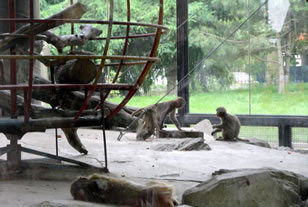 猴山位于園的東部,占地面積約1000平方米,為下沉式結(jié)構(gòu),場館中央用山石堆積成兩座假山,之間懸掛軟梯、輪胎等游樂設(shè)施。外圍橢圓形的圍墻,圍墻高3.1米,從假山到圍墻的距離為5.9米。在北側(cè)的圍墻處,有一空間,可供猴群在惡劣的天氣里遮風(fēng)避雨。1986年和1993年,兩次對(duì)猴山進(jìn)行維修和改造,加固山石,接通上、下水。因不時(shí)會(huì)發(fā)生頑皮、健壯的成年猴子,借山石之力躍出猴山,為此,沿墻壁設(shè)置低壓電網(wǎng),并根據(jù)猴子對(duì)色彩的不同反映,在電網(wǎng)處涂上紅、白兩種顏色,以引起猴子的警覺。