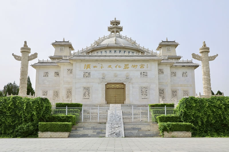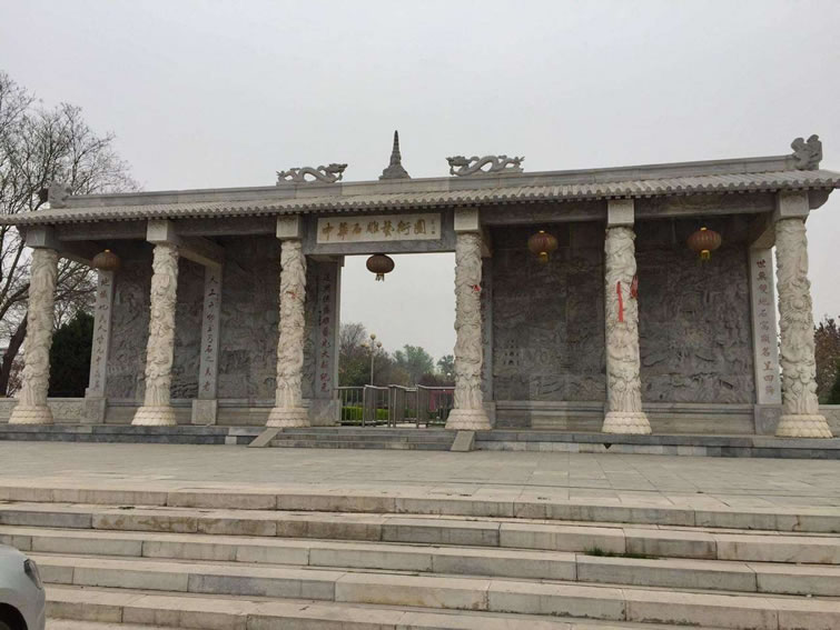 中華石雕藝術(shù)園 大石窩中華石雕藝術(shù)園位于北京市房山區(qū)大石窩鎮(zhèn)。園區(qū)面積2400畝,園區(qū)內(nèi)以石為主。石神、石鼎、石橋、十二生肖各種雕塑均以大理石為原材料,精雕細(xì)作而成,充分突出了石雕的藝術(shù)特色,是北京地區(qū)最大的石雕主題公園。漢白玉藝術(shù)宮位于中華石雕藝術(shù)園內(nèi),于2002年2月份動土施工,建筑面積2200平方米。工程的用料全部采用質(zhì)地精良的漢白玉石材,共使用漢白玉石料740多立方米。藝術(shù)宮高27米,最高端是一座棲賢亭,下面是一個半球型的漢白玉天棚,天棚的東、南、西、北、東南、西南、東北、西北方向各有一條漢白玉脊龍,天棚下端是由36根漢白玉側(cè)柱組成的圓柱型建筑,宮門的正上方是長方形的漢白玉牌匾題有雕塑書法大師錢紹武提寫的“漢白玉石雕藝術(shù)宮”。藝術(shù)宮四周的漢白玉角柱、立板共280塊,其中鑲有各種圖案的漢白玉浮雕,在藝術(shù)宮的東西兩側(cè)還開有高4.4米的九龍漢白玉卷拱門。每道門正下方均有一塊好似保和殿前“云龍階石”的御路。