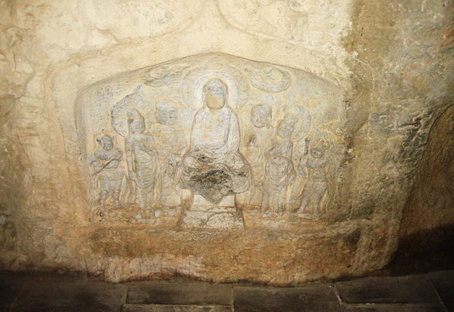 唐代摩崖造像 唐代摩崖造像位于張坊鎮(zhèn)大峪溝村東北,為房山區(qū)重點保護文物單位。造像在高3米、寬4米的青石斷面上,共有有摩崖造像2龕。左側一龕高0.88米,寬0.98米,中為佛祖釋迦牟尼坐像,兩側列眾弟子和金剛力士,頂部有二飛天,共有造像9尊,龕內兩側有題記,左為“照一天下八月二十四日佛放光日豪護佛神王”,右為“護法力士”。右側一龕高1.7米,寬0.85米,龕內只有一尊釋迦牟尼像端坐于須彌座上,佛祖面方口闊,雙目微睜,兩耳垂肩,衣衫寬松,左臂下垂,右手平置,雙腿垂下,足踐蓮花。石刻造像線條流暢,技法嫻熟。