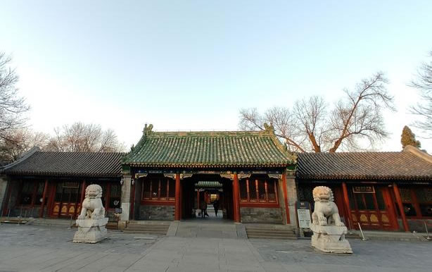 建于同治年間(1862-1874年),是恭親王及其親友看戲的場所。這座戲樓是我國現(xiàn)存獨一無二的全封閉式大戲樓。在清廷檔案中,戲樓均稱為“大戲房”。建筑面積685平方米,其建筑形式采用三卷勾連搭全封閉式結(jié)構,據(jù)說整個大戲樓雖為磚木結(jié)構建筑卻沒有用一根鐵釘。尤其值得一提的是大戲樓的聲音效果。大戲樓為了保證聲音逼真,將戲臺底下掏空后放置了若干口大缸,巧妙特殊的構造增大了共鳴混響空間,使觀眾身處戲樓里的任何位置,都能清晰地聽到不借助任何傳聲工具的演員的演唱。