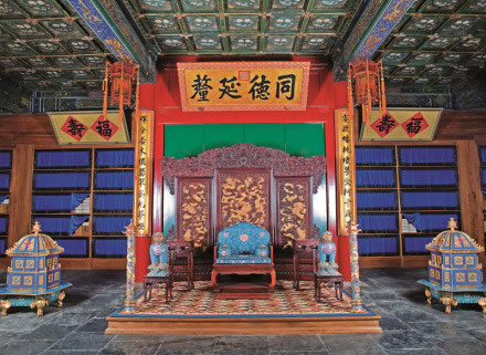 “多福軒”此匾為咸豐皇帝所題。意為幸福很多的殿堂。殿內(nèi)正中懸掛“同德延禧”匾額,意在告誡主人:你與皇帝同德才能延禧(禧:吉祥如意、福壽綿長)。殿內(nèi)四壁靠近天花板的地方皆懸掛福壽字匾,這些福壽字均寫于紅色方紙之上(即“斗方”)呈梭形擺放,一福一壽成對制成匾額。
