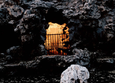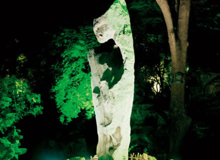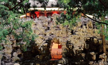 安善堂”北有一座假山,名叫滴翠巖。藏有康熙福字碑的秘云洞,就位于“滴翠巖”中心腹部。假山頂是整個花園的制高點,頂上的建筑叫“綠天小隱”;建筑前面的平臺為“邀月臺”,是賞月的地方。