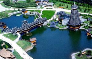 侗族建筑:侗族建筑景區(qū)占地4000平方米,建筑面積571平方米,建筑復(fù)原按貴州省從江、黎平地區(qū)的侗族典型建筑。規(guī)劃形式為寨,由鼓樓、風(fēng)雨橋、寨門、戲臺、民居、水車、碾房、谷倉、稻田等組成。侗族建筑以杉木為原料,民居形式為干欄式。