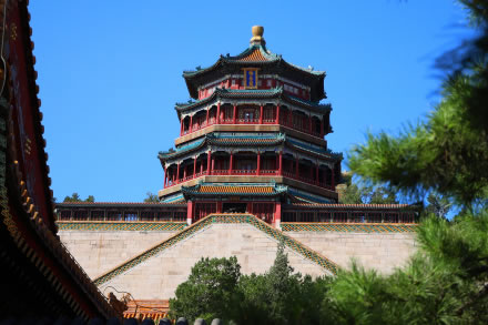 佛香閣位于在萬壽山前山中央部位的山腰,建筑在一個高21米的方形臺基上,是一座八面三層四重檐的建筑;閣高41米,閣內(nèi)有8根巨大鐵梨木擎天柱,結(jié)構(gòu)復雜,為古典建筑精品。原閣咸豐十年(1860年)被英法聯(lián)軍燒毀后,光緒十七年(1891年)花了78萬兩銀子重建,光緒二十年(1894年)竣工,是頤和園里最大的工程。閣內(nèi)供奉著“接引佛”,供皇室在此燒香。