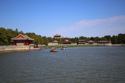 昆明湖是清代皇家諸園中最大的湖泊,湖中一道長堤──西堤,自西北逶迤向南。西堤及其支堤把湖面劃分為三個大小不等的水域,每個水域各有一個湖心島。這三個島在湖面上成鼎足而峙的布列,象征著中國古老傳說中的東海三神山──蓬萊、方丈、瀛洲。西堤以及堤上的六座橋是有意識地摹仿杭州西湖的蘇堤和“蘇堤六橋”。西堤一帶碧波垂柳,自然景色開闊,園外數(shù)里的玉泉山秀麗山形和山頂?shù)挠穹逅芭抨Y而來,被收攝作為園景的組成部分。