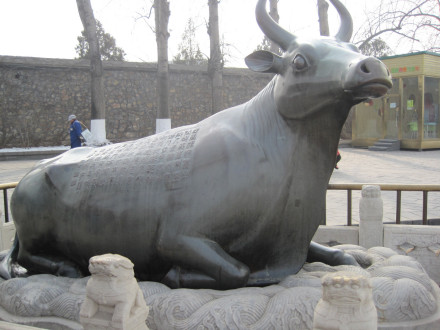 銅牛在昆明湖東岸,十七孔橋東橋頭北側(cè),為鎮(zhèn)壓水患而設(shè)。乾隆二十年1755年用銅鑄造,稱為“金!薄