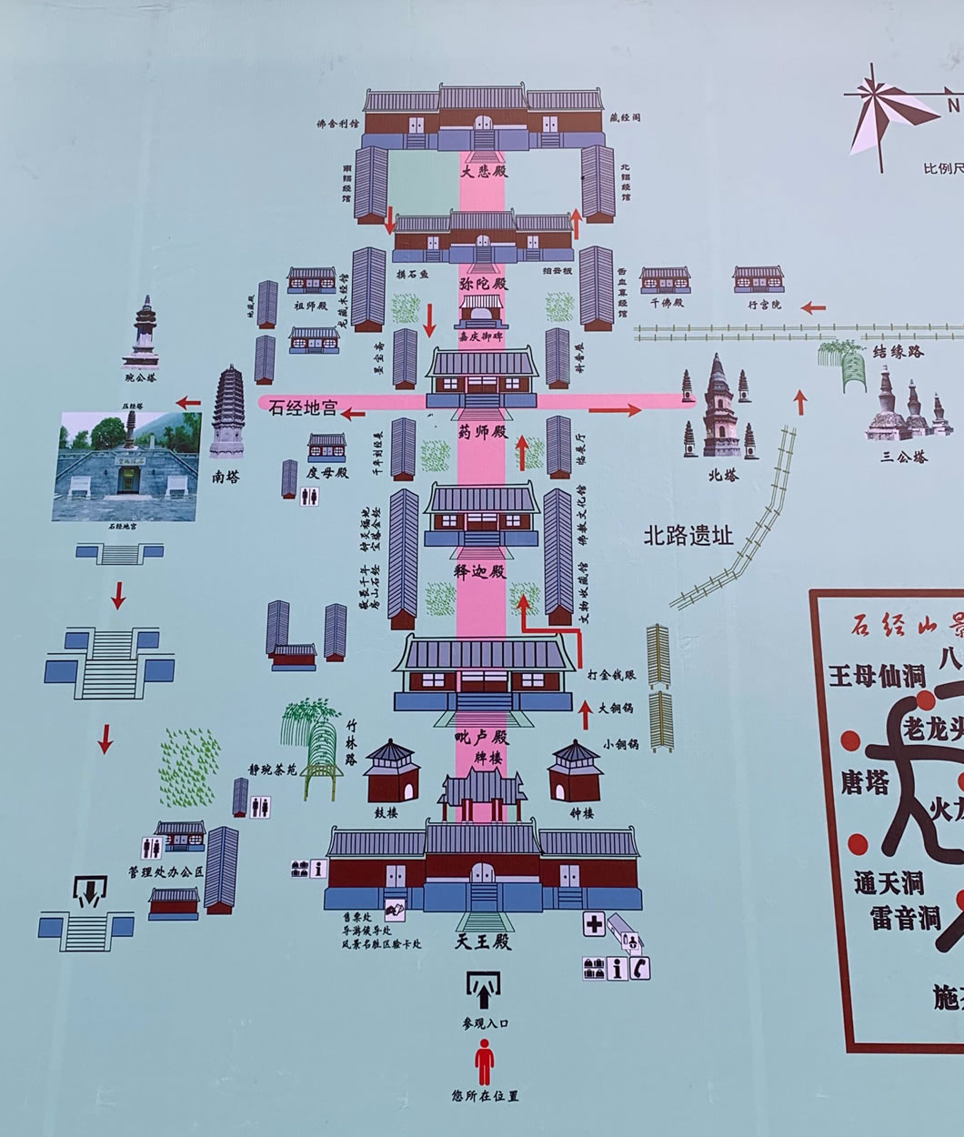 石經(jīng)山海拔450公尺,山腰有9個(gè)藏經(jīng)洞,其中雷音洞為開放式,洞內(nèi)寬廣如殿,四壁鑲嵌經(jīng)板大都是靜琬早期所刻。洞中有四根石柱,石柱上雕佛像1056尊,故稱千佛柱,九洞共藏經(jīng)4196塊。石經(jīng)山現(xiàn)存唐塔兩座,還有石鑿古井、隋唐碑刻等大批歷史遺存。為了便于游客上山觀光攬勝,云居寺于1999年10月24日開通了全長(zhǎng)830米的石經(jīng)山索道。