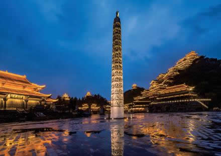 九黎神柱是苗族的象征之柱,采用漢白玉精雕細刻而成,總高24米,象征一年四季十二個月、二十四節(jié)氣,有圓滿團圓之意。神柱上雕刻苗族古歌里崇拜的三十六堂鬼、七十二堂神(三十六天罡、七十二地煞)雕像,這些鬼神都是苗族的保護神。苗族先民把楓木作為圖騰,由于楓樹木放在室外容易腐爛,九黎神柱采用石材雕刻而成,是雕刻人物最多的少數(shù)民族圖騰柱。是蚩尤黎城第三個被列入大世界基尼斯之最的建筑。