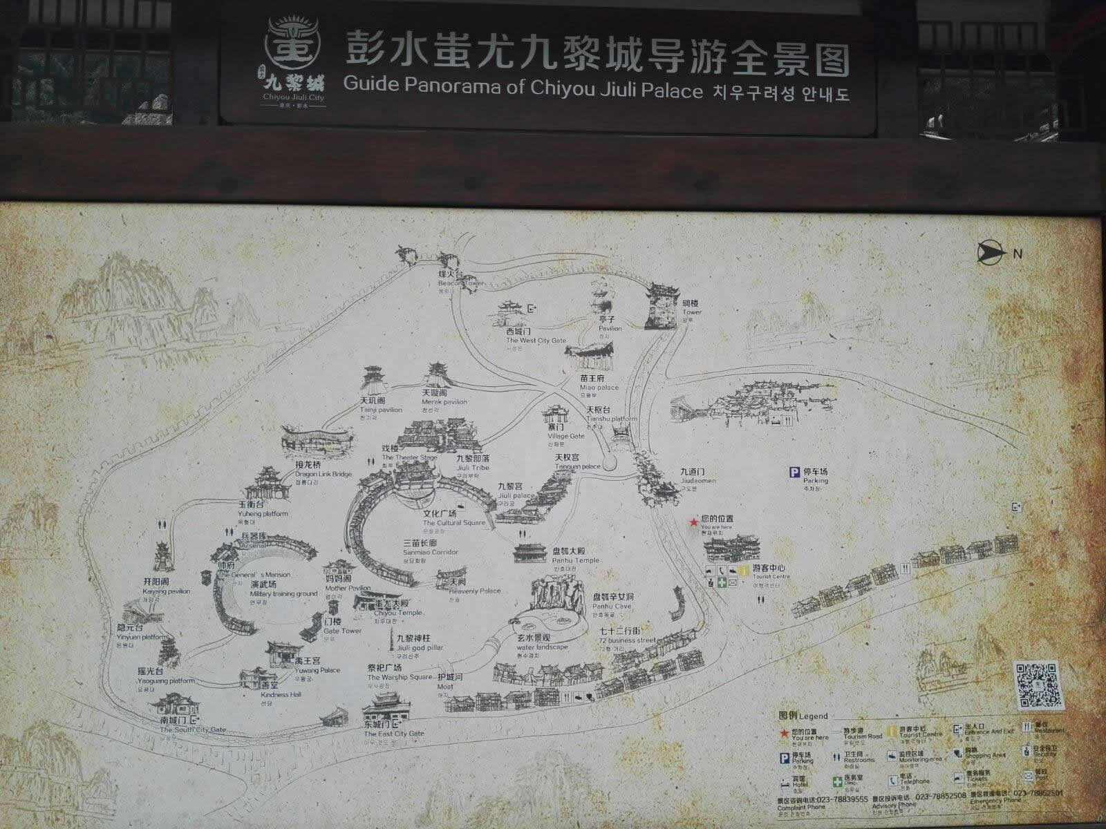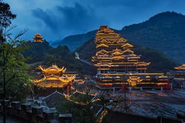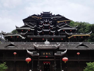 九黎宮位于景區(qū)中心苗族文化廣場右邊,是蚩尤九黎城最重要的標志性建筑,九黎宮科學地利用山水自然資源,因地制宜,依山造勢,退山而居。宮高99米,呈十一開間,象征“九九歸一”之意。建筑的形式有四合院、吊腳樓、沖天樓,宮內(nèi)有苗族接龍?zhí)、曬樓、虎口堂、四合院、八字朝門和吊腳樓群等,是彭水展示苗族文化、民風民俗的博物館,是迄今為止最大的吊腳樓群之一,被列入大世界基尼斯之最。