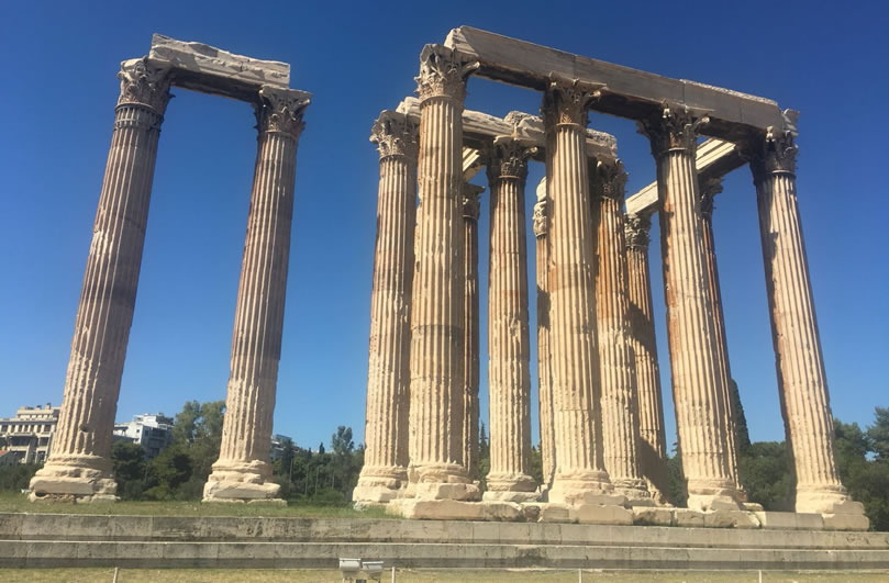 宙斯神廟 宙斯神廟位于希臘雅典衛(wèi)城東南面,是為了祭祀宙斯而建的,也是古希臘最大的神廟。宙斯神廟建于公元前470年,于公元前456年完工,由建筑師Libon設計,宙斯神像則由雕刻家菲狄亞斯負責。直到公元前86年,羅馬指揮官蘇拉(Sulla)攻占雅典,破壞了尚未完成的建筑,將一部分石柱和其他建材拆下來之后,運到羅馬。直到今天,在羅馬市中心的古羅馬廣場遺址上,還能看見它們。宙斯廟尤以象牙和黃金的塑像而聞名于世。 宙斯神廟是伊奧尼亞風格的建筑,后來改用了科林斯式石柱風格,而且一概使用大理石。整個建筑坐落在一塊205米長,130米寬的地基上,神廟本身長107.75米,寬41米,共有104根科林斯柱。每根石柱高達17.25米,頂端直徑達1.3米,約計用大理石1.55萬噸。和眾多的古希臘神廟一樣,宙斯神廟也遭受嚴重的破壞,104根柱子中僅存13根。宙斯神廟和哈德良拱門隔路相望,宙斯神廟位于路南,而哈德良拱門則位于路北,這兩座建筑都是由距今1900多年前的羅馬帝國國王哈德良時期修建的。我們已經(jīng)無法看到宙斯神廟和哈德良拱門的原始形態(tài),只能通過斷壁殘垣來回憶當時的輝煌。