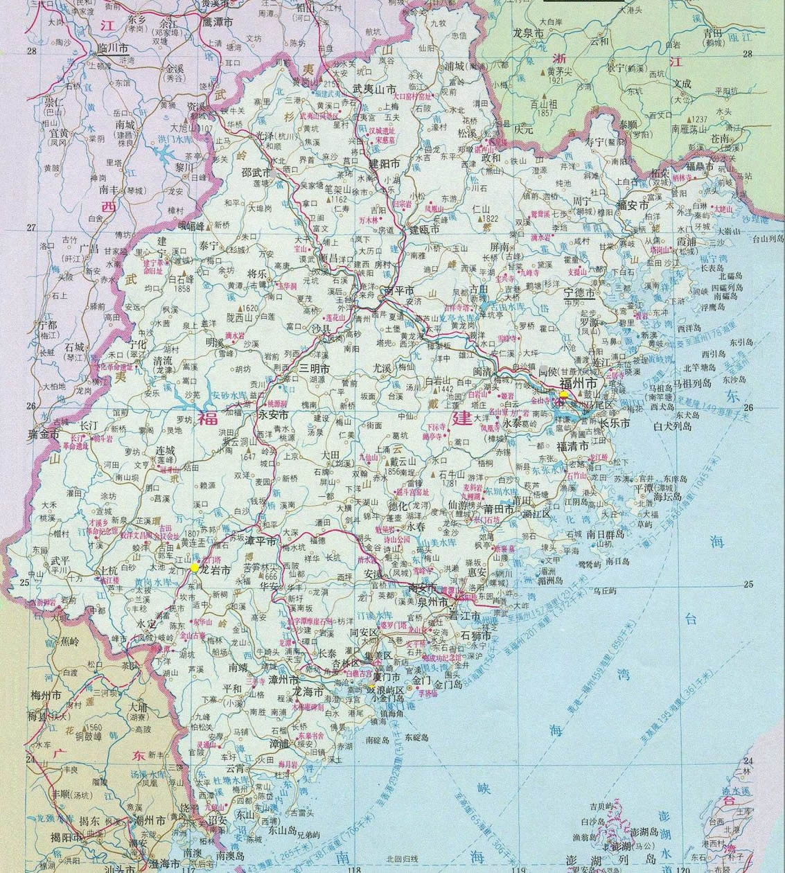 福建地處中國(guó)東南沿海(北緯28 ° 30′~28° 22′,東經(jīng)115° 50′~120° 40′), 毗鄰浙江 、江西 、廣東 、與臺(tái)灣隔海相望,是中國(guó)大陸距離東南亞和大洋洲海上距離最近的省份之一,也是中國(guó)與世界交往的重要窗口和基地 。  福建境內(nèi)常年溫暖濕潤(rùn),年平均溫度17℃~21℃,平均降雨量1400mm~2000mm 。 全省土地面積12.14萬(wàn)平方公里,其中山地丘陵占80%以上 。 福建是以漢族為主、多民族聚居的省份,到2000年為止,全省常住人口將達(dá)到3470萬(wàn)人 。福建又是著名僑鄉(xiāng)和臺(tái)胞祖籍地,旅居海外的華人、華僑達(dá)800多萬(wàn)人,臺(tái)灣同胞中80%祖籍福建。