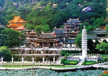 南普陀寺,位于廈門市思明區(qū),始建于唐末五代,初稱泗洲院。北宋僧文翠改建稱無盡巖。元廢。明初復(fù)建,更名普照寺。明末詩僧覺光和尚遷建于山前,殿堂院舍齊備,住僧常達(dá)百余眾,清初又廢于兵禍。清康熙二十二年(1684年),靖海候施瑯收復(fù)臺灣后駐鎮(zhèn)廈門,捐資修復(fù)寺院舊觀,又增建大悲閣奉觀音菩薩,并以之與浙江普陀山觀音道場相類比,更名為南普陀寺,此后數(shù)百年來,經(jīng)歷代主持景峰、省己、喜參諸和尚多次重修擴建,至民國初年,已構(gòu)成三殿七堂俱全的禪寺格局。