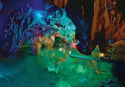 瑤池玉女: 高處懸掛著一盞巨大的宮燈,燈下是一塊巨石,石邊上立著一片長(zhǎng)條條、孤零零的石筍。繞到下方仰望,石頭斜傾,玉女剎那間變成在大風(fēng)大浪中奮力劃船的漁家婦女。還有人說(shuō)是莫愁女、是率眾仙渡海的觀音、是日本姑娘等。