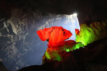 五更天: 前面“天際”出現(xiàn)魚肚白,邊上還有雄雞報(bào)曉石,接著,右前方洞頂閃爍著一顆啟明星。往前走,啟明星變成了半個(gè)月亮。在空氣濕度大、風(fēng)小、洞口外有陽(yáng)光的時(shí)候,半月旁還會(huì)出現(xiàn)一輪像彩虹一般的“佛光”。 |