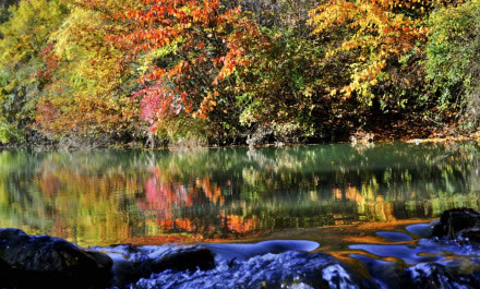 官鵝溝水美。13個(gè)大小不等、形態(tài)各異的湖泊,尤如一串綠色的珍珠鑲嵌在溝內(nèi),湖水清澈透底,隨湖底地貌高低呈不同顏色,那些倒映在湖中的古樹(shù)象一條條巨龍臥在湖底。藍(lán)天白云和青山古樹(shù),映入湖中,使天地渾然一體,沒(méi)有界限。