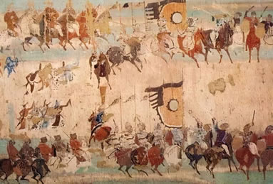 敦煌作為中西交通的樞紐,在壁畫上不僅留下了商旅來往的活動情況,還留下了寶貴的交通工具的形象資料。他們有牛馬駝騾、驢象舟船、車轎輿輦等。常用的交通工具車輛類型各異,牛車有“通牛車”、“偏牛車”、敞篷牛車,馬車有駟車、駱車,還有駱駝車、童車、獨輪車等,特別是保存了中國為世界交通做出獨有貢獻(xiàn)的獨輪車、馬套挽具(胸帶挽具和肩套挽具)、馬蹬、馬蹄釘掌等珍貴的圖像數(shù)據(jù)。西魏第285窟、北周第296窟五百盲賊皈依故事畫,表現(xiàn)了騎著戰(zhàn)馬的騎兵,與身穿褲褶的步兵(強(qiáng)盜)作戰(zhàn)的場面,畫面上畫出了馬鎧,它是保護(hù)戰(zhàn)馬的防護(hù)裝備,古稱具裝,或具裝鎧。第285窟馬鎧的形制齊全,從保護(hù)馬頭的“面簾”、到保護(hù)馬鞍后尻部的“寄生”一應(yīng)俱全。反映了漢代已有的具裝,到北朝時期已發(fā)展為玩唄成熟的保護(hù)裝備。馬鎧的產(chǎn)生和發(fā)展是中國為世界軍事裝備所作的獨有貢獻(xiàn)。