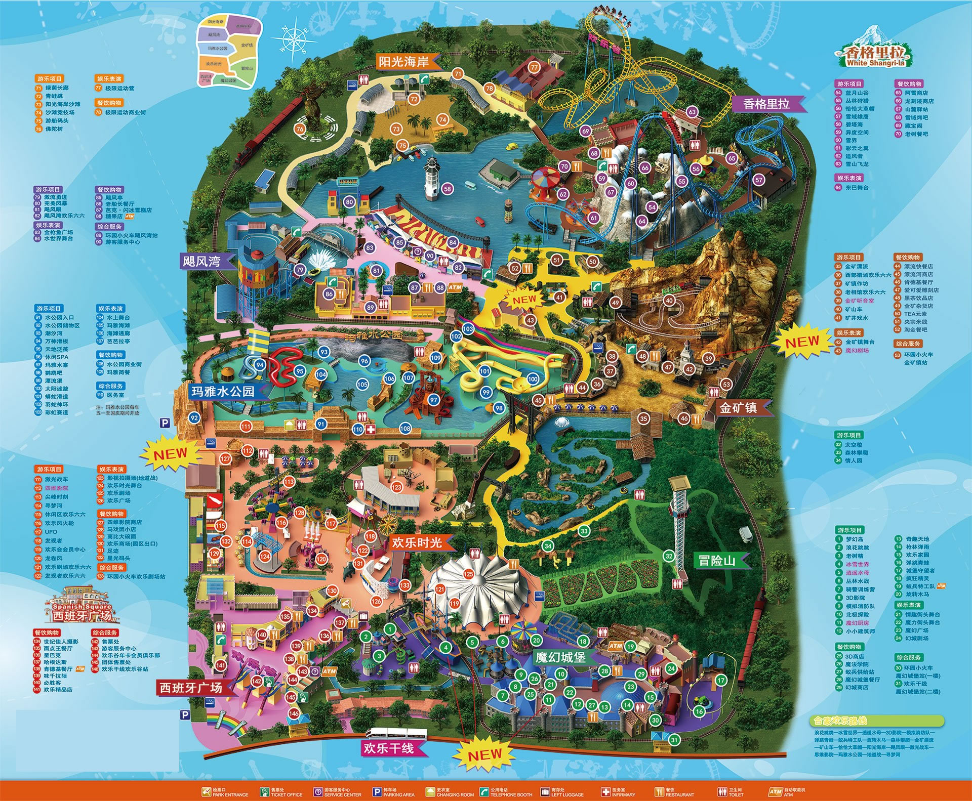全公園共分八大主題區(qū):西班牙廣場、卡通城、冒險山、歡樂島、金礦鎮(zhèn)、香格里拉森林、颶風灣、陽光海岸,加上奇趣的瑪雅水公園,有一百多個老少皆宜、豐富多彩的游樂項目。從美國、荷蘭、德國等發(fā)達國家引入眾多全國乃至亞洲獨有的項目:世界最高落差的"激流勇進"、中國第一座懸掛式過山車"雪山飛龍"、中國第一座巷道式"礦山車"、中國第一座"完美風暴"、中國第一輛"仿古典式環(huán)園小火車"、亞洲最高、中國第一座"驚險之塔"--太空梭、亞洲首座集視覺、聽覺、觸覺于一體的四維影院。這些游樂項目附以了逼真而完美的主題包裝,營造出環(huán)境優(yōu)美宜人,具有美國西部和中國藏北風格的景觀。一次次驚心動魄的歷程,一個個撲朔迷離的故事,讓游客仿佛進入一個亦真亦幻的神秘境界。