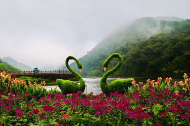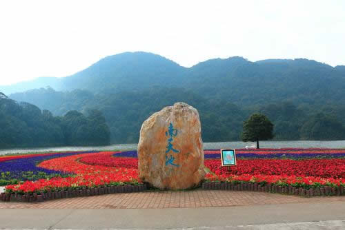“七彩天池”花海是石灶風光區(qū)的天池花海景點國慶期間的一個特色,由多種顏色的花卉共同組成。大紅色的一串紅、金黃色的硫化菊、紫色的千日紅、橙色的百日草、深紅色的紅穗冠、淡黃色的黃穗冠和粉色的朱唇等匯聚成一道亮麗的彩虹,降落在藍天碧水之間,創(chuàng)造出一個七彩斑斕的童話世界。同時,圍繞著這七色花海還有大波斯菊與醉蝶花。紅的,粉的,紫的,白的小花配以音樂等元素造型共同點綴著這幅優(yōu)美的畫卷!捌卟侍斐亍弊罴延^賞期為9-11月。