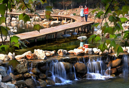 田園風光區(qū)是公園為游客提供食宿、餐飲、娛樂、會議的場所。有近千畝名、優(yōu)、特、稀果樹品種,游客在進入公園其它景區(qū)前,就可以領略公園的田園風光,在這里,游客也可以在不同季節(jié)直接到果園品嘗不同的名優(yōu)水果。在這里可以參觀古炮樓、虎神廟、蝠王洞天、偉人臥像、百丈飛瀑等景點。