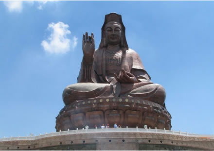 云海蓮臺地處西樵山風(fēng)景名勝區(qū)中心地帶,是以觀音文化為主題的大型景區(qū)。主要建筑有觀音法相、牌坊、影壁、放生池和浮雕等。觀音法相高達(dá)61.9米,是世界上最高的觀音造像。游客從北向入口,迎面聳立著一座六柱五門天柱牌坊,牌坊后隔著一個廣場,建有影壁,用優(yōu)質(zhì)花崗巖雕筑,左右各設(shè)山門,壁后刻有觀音六字真言,漢文由九華山住持、安徽省佛教協(xié)會會長仁德手書,藏文由西藏活佛親筆題寫。影壁上還刻有韋陀法像。影壁后為一放生池,池旁圍以蓮花作雕的白石欄桿,跨過放生池上的石拱橋,沿著283級開闊而整齊的石臺階,便可達(dá)觀音法像的蓮花座下。