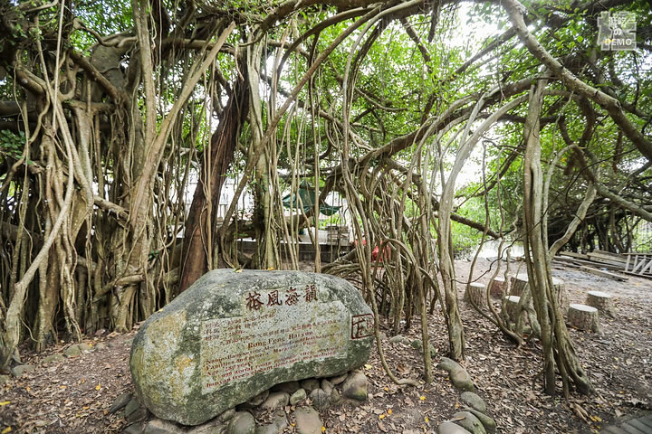 竹山古榕部落由一棵一千三百多年的古榕和眾多小葉榕組成。古榕為高山榕,榕樹高大挺拔,樹干需十三個(gè)成人張開雙臂才能合抱。而這一株株榕樹,也許是海風(fēng)終年吹拂的緣故,榕樹長到一定高度后就橫向生長,長出許多氣根,氣根接觸地面后長成一根根枝干,這樣的氣根不知多少,數(shù)不勝數(shù),遠(yuǎn)遠(yuǎn)望去,一株榕樹就是一片樹林,在綠茵如水的野芋叢中,構(gòu)成了“頃地一古榕,飛瀑掛潭中”的佳景,打造了古榕部落“雙龍出海”、“四郎探母”、“六柱擎天”、“八仙會(huì)聚”以及榕樹瀑、榕樹墻、榕樹戀、榕樹侶等惟妙惟肖的生態(tài)奇觀。