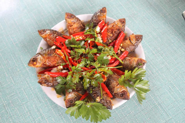 全州禾花魚 全州禾花魚,為長時(shí)期稻田放養(yǎng)馴化選育品種,因食水稻落花而得名。最遠(yuǎn)可追溯至漢代,唐昭寧年間,劉恂在《嶺表錄異》中有詳細(xì)文字記載。乾隆時(shí)成朝廷貢品,譽(yù)滿京城。禾花魚年產(chǎn)兩次,總產(chǎn)量1000噸左右,以重約1兩至2兩,長約2至3寸為宜。有青蒸、水煮、紅燜、油炸、煎、火烤、煙熏等十余種吃法。