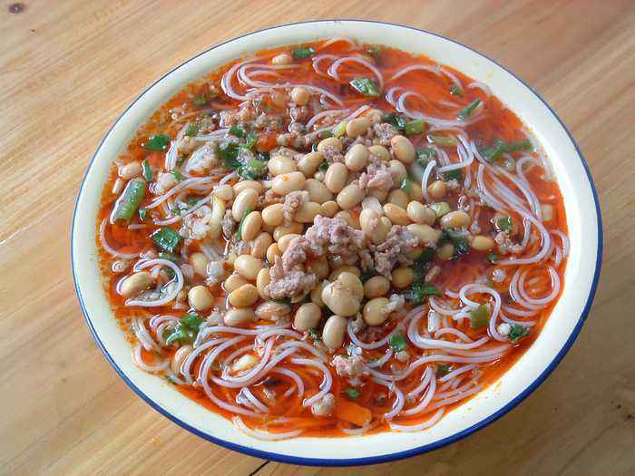 紅油米粉 紅油米粉是全州縣的傳統(tǒng)風(fēng)味小吃之一,是本地人的早點(diǎn),主要以:米粉、肉湯打底,紅油浮面,綠蔥點(diǎn)綴。