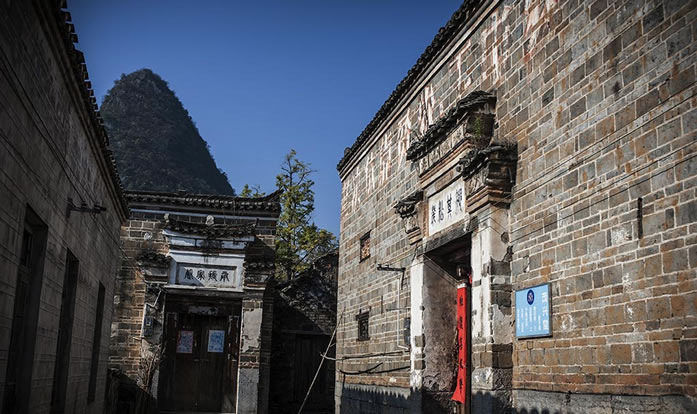 在明洪武年間,山東一位被貶的秦姓官員千里跋涉來(lái)到桂北地區(qū),據(jù)村民說(shuō),他們是唐代名將秦瓊的后人。后來(lái)秦氏的一支看中了水源頭村自周的山形地勢(shì),于是選取了這個(gè)“風(fēng)水寶地”落下根基。經(jīng)過(guò)多年繁衍,漸成規(guī)模。在后籠山下,依山勢(shì)拾級(jí)而建成了成片的大宅子,當(dāng)?shù)厝朔Q(chēng)其為“秦家大院”。這些宅子基本為三進(jìn)三開(kāi),房屋分為四組,組與組間隔兩米,形成狹長(zhǎng)的巷道,均以青石板鋪筑。宅子的高堂、戲院、花廳都敞開(kāi)大門(mén),兩旁房子的大門(mén)朝里開(kāi),很有意思。宅子的墻壁都以幾噸重的青石方墩為基,砌上1米多后,改用青磚砌至屋頂,很獨(dú)特。高大敞亮的上層樓房,窗戶上鑲嵌的窗花是琉璃瓦燒制而成,上面還畫(huà)著花卉,溫婉中透著古色古香。房中的板壁上刻著各種花紋的圖案,庭柱下的石礅上鑿有龍鳳的花飾,精細(xì)美觀。
