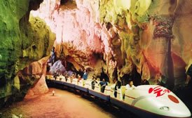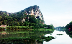 冠巖位于桂林市南29公里處,漓江東岸的草坪鄉(xiāng),因山形如帝王的紫金冠而得名。冠巖是一個巨型地下河溶洞,全長12公里,發(fā)源于桂林東面的海洋山。冠巖1995年正式對外開放,群峰競秀,碧水傳情,洞奇石美。 夜幕降臨,還有美妙的民族歌舞晚會,熱情的山歌響徹峽谷。