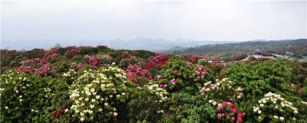 初步查明,百里杜鵑風(fēng)景區(qū)有馬纓杜鵑、大白花杜鵑、水紅杜鵑、露珠杜鵑等41種,占世界杜鵑花5個亞屬中的全部;ㄉ鄻樱k爛生輝。每年3月到5月次第開放,百里花山色彩繽紛,猶如廣袤的錦緞華章鋪山蓋嶺,百態(tài)千姿。被譽為“地球彩帶、世界花園”。