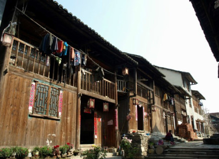早期的民居建筑也大多還保留著漢文化的特點,以安徽、江西居多,其建筑形式、藝術手法均具明顯的徽派建筑特點。民居的基本單元一般為開間10米(三間開),進深8米左右的兩到三層木構建筑。建筑結構采用穿斗式人字形坡頂,蓋小青瓦,外圍磚墻或泥石墻,頂部做成迭落形,端部做成馬頭狀,俗稱“馬頭墻”。屋檐出水向外挑出30厘米,采用“雙重脊檐”形式,青色的披檐鑲嵌在灰白色磚墻上。宅基均高出地面1米,房屋之間相對排列整齊有序,每家每戶前均有清一色的幾階青石臺基排列,大門上掛有標志著屋主籍貫、身份的匾額,如“關西第”、“科甲第”、“洛陽第”等,且大門外墻呈“外八字”結構,其平面布置自外而內,先門第,再前屋,再正屋、后屋,每一屋均由天井相隔,天井以青石鋪就,低于臺基,天井內放有青石制成的防火缸,缸上雕龍或飾有古代兵器戟,內有暗溝以便排水,古鎮(zhèn)民居內每戶必有一后門,且后門戶戶相通,目的是為了軍人家眷躲避戰(zhàn)火,戰(zhàn)事來臨時家家互相通告,由后門撤離至安全地帶。