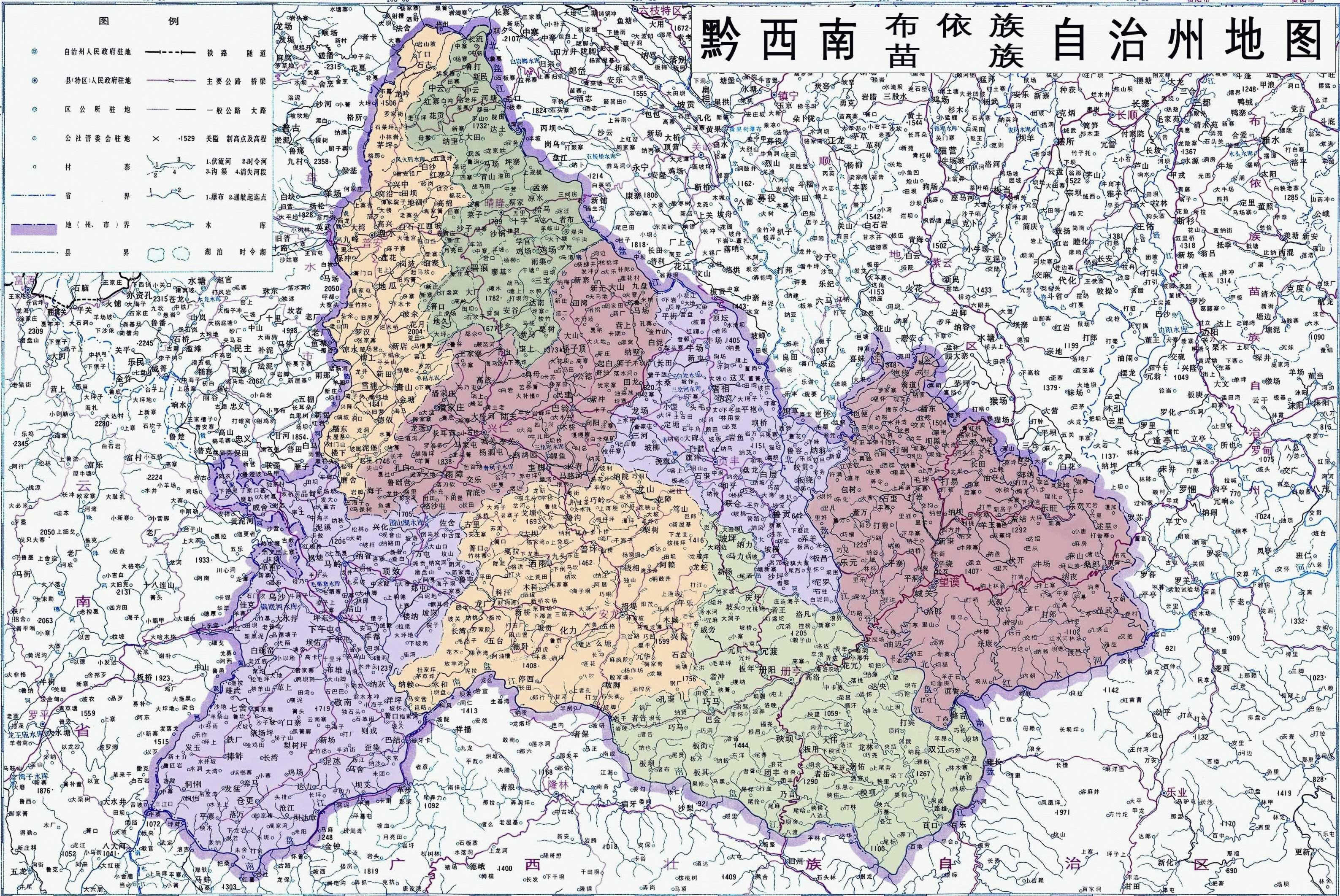 1965年,經(jīng)中央人民政府批準(zhǔn),恢復(fù)興義專區(qū),專署駐興義縣,將安順專區(qū)所屬興義縣、興仁縣、盤縣、普安、晴隆5縣和黔南布依族苗族自治州的望謨、冊(cè)亨、安龍、貞豐4縣劃入興義專區(qū)。