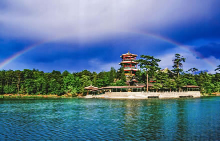 湖泊區(qū):苑景區(qū)的精華基本上在湖泊區(qū),康熙曾夸耀說,“天然風(fēng)景勝西湖”。由于洲島錯落,湖面被長堤和洲島分割成5個湖,各湖之間又有橋相通,兩岸綠樹成蔭,山莊主要的風(fēng)景建筑又都散落在湖區(qū)的周圍,因此顯得曲折有致,秀麗多姿。湖泊區(qū)位于山莊東南,面積49.6萬平方米。有大小湖泊八處,即西湖、澄湖、如意泅、上湖、下湖、銀湖、鏡湖及半月湖,統(tǒng)稱為塞湖。 湖區(qū)的風(fēng)景建筑大多是仿照江南的名勝建造的,如“煙雨樓”,是模仿浙江嘉興南湖煙雨樓的形狀修的。金山島的布局仿自江蘇鎮(zhèn)江金山。湖中的兩個島分別有兩組建筑,一組叫“如意洲”,一組叫“月色江聲”!叭缫庵蕖鄙嫌屑偕健鐾、殿堂、廟宇、水池等建筑,布局巧妙,是風(fēng)景區(qū)的中心!霸律暋笔怯梢蛔碌乃暮显汉蛶鬃、堂組成。每當(dāng)月上東山的夜晚,蛟潔的月光,映照著平靜的湖水,山莊內(nèi)萬籟俱寂,只有湖水在輕拍堤岸,發(fā)出悅耳的聲音,“月色江聲”的題名便是由此而來。湖泊區(qū)集南方園林之秀和北方園林之雄,將江南園林的景觀移植到塞外。區(qū)內(nèi)湖泊總稱“塞湖”,總面積57公頃。