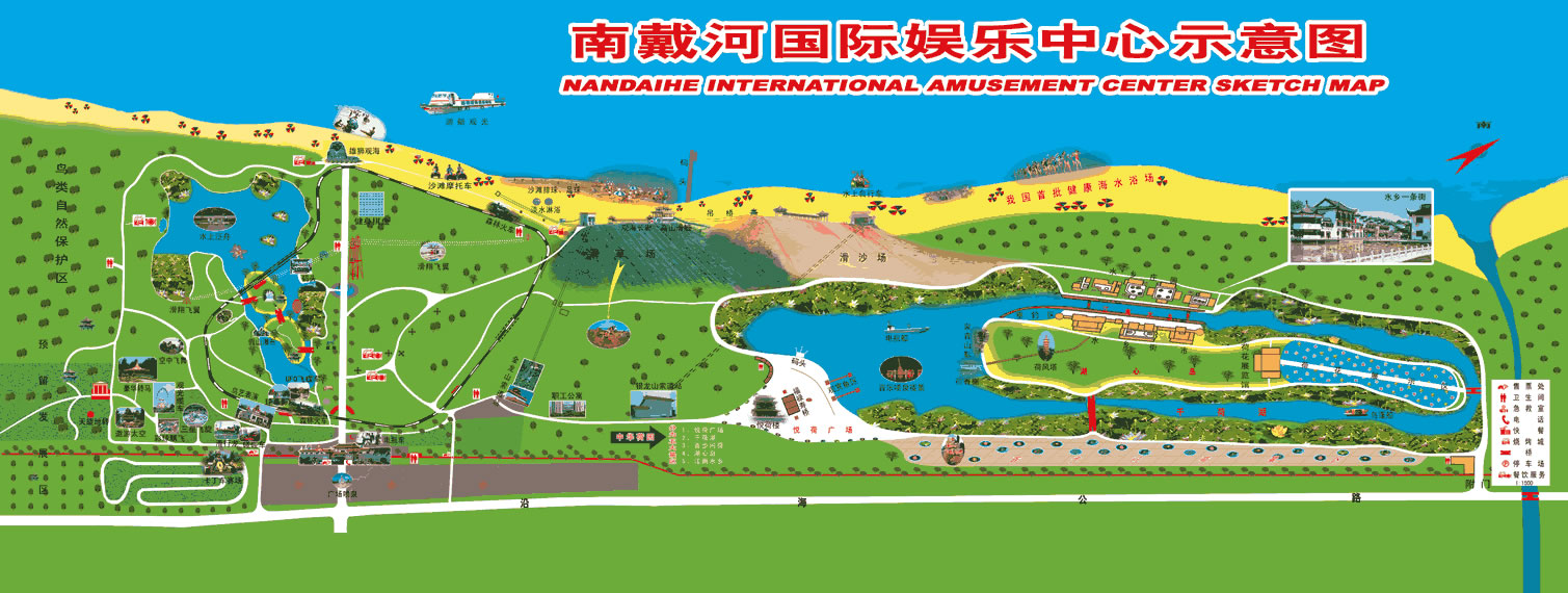 南戴河國際娛樂中心包含歡樂大世界、碧海金沙、金龍山、中華荷園、槐花湖五大區(qū)域。這里遠(yuǎn)離污染,環(huán)境清幽,空氣清新,植被蔥郁,完全具備了當(dāng)今國際海岸旅游的五大要素:海洋、沙灘、陽光、空氣、綠色。