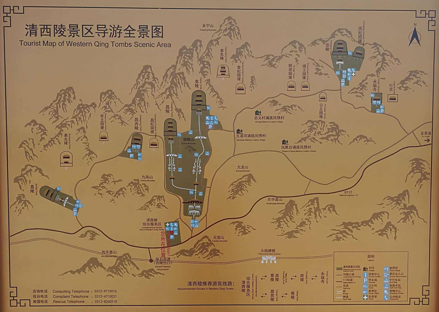 清西陵陵區(qū)內(nèi)各陵園共用祖山、石牌坊、大紅門,周圍均用風(fēng)水圍墻和火道、界樁圍繞。陵寢布局有主有從,皇后陵和妃園寢均以本朝帝陵為中心,分建左右,自成一區(qū),體現(xiàn)了附屬關(guān)系,表明陪葬之意。各帝陵神道均與主陵神道相接,后陵神道與本朝帝陵神道相接,形成枝狀的神道網(wǎng)絡(luò)。這些特點(diǎn)是清代以前的歷代皇陵所不具備的。整個清西陵陵區(qū)以清世宗雍正帝的泰陵為中心,西面分布著清仁宗昌陵和清宣宗慕陵,東面分布著清德宗崇陵、溥儀墓以及阿哥、公主園寢和永福寺等建筑。