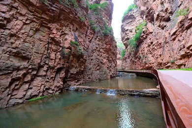 峽長4000米,一般寬1到2米,最窄處只有十幾厘米,壁高150米,這里紅巖絕壁,險(xiǎn)峰對峙,黃巢曾在此聚兵起義,抬頭仰望,青天一線,俯視腳下,水流不斷,相隔不遠(yuǎn)便有一道瀑布,溪水清澈見底,清涼透骨。
