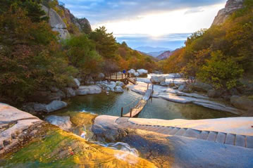 夏季,風(fēng)涼氣爽,云蒸霞蔚。登臨主峰,可觀云海,看日出,瞧佛光,俯群山。云海、云流、云瀑是祖山夏季的特有景觀。因祖山海拔較高,又瀕臨渤海,此時(shí)登臨任何峰頂,可觀到滔滔的云海,觸摸到擦肩而過(guò)的朵朵白云,她們一會(huì)兒行云流水,環(huán)山而淌;一會(huì)兒宛如融雪的春潮,裊裊地升入蔚藍(lán)的天空;一會(huì)兒像脫結(jié)的野馬,入海的姣龍,奔騰咆哮,排山倒海。當(dāng)你倘佯在“北龍?zhí)丁、“花果山”景區(qū)時(shí)俯看谷中,涓涓細(xì)流,清澈見(jiàn)底;仰望山間,瀑布飛掛,奔騰咆哮,大有“飛流直下三千尺,疑是銀河落九天”之氣魄沿溝谷而下,那真是水繞青山,山繞水,山浮綠水,水浮山。