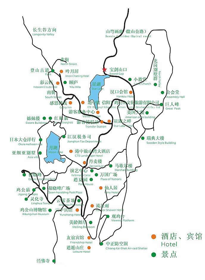 避暑山莊現存別墅十組二十幢7800平方米,計劃逐步整修,現保存較好的有肖家大樓、環(huán)翠樓、聳青閣、臥虎樓、翠云樓等。