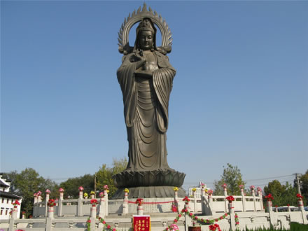 觀音菩薩為雙面造型,黃銅鑄造,周?chē)菨h白玉欄桿,像高18.8米,立于一個(gè)3米高的蓮臺(tái)之上,重達(dá)20噸,雙面觀音為二臂正觀音基本形,也稱(chēng)為圣觀音像。