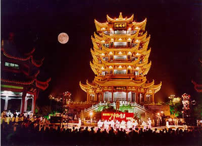 吹奏,道士跨上黃鶴直上云天。辛氏為紀(jì)念這位幫她致富的仙翁,便在其地起樓,取名“黃鶴樓”。
