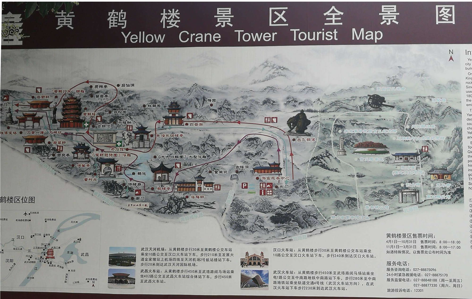 塔、碑廊、山門等建筑。整個(gè)建筑具有獨(dú)特的民族風(fēng)格。黃鶴樓內(nèi)部,層層風(fēng)格不相同。底層為一高大寬敞的大廳,其正中藻井高達(dá)10多米,正面壁上為一幅巨大的“白云黃鶴”陶瓷壁畫,兩旁立柱上懸掛著長(zhǎng)達(dá)7米的楹聯(lián):爽氣西來(lái),云霧掃開天地撼;大江東去,波濤洗凈古今愁。二樓大廳正面墻上,有用大理石鐫刻的唐代閻伯瑾撰寫的《黃鶴樓記》,它記述了黃鶴樓興廢沿革和名人軼事;樓記兩側(cè)為兩幅壁畫,一幅是“孫權(quán)筑城”,形象地說明黃鶴樓和武昌城相繼誕生的歷史;另一幅是“周瑜設(shè)宴”,反映三國(guó)名人去黃鶴樓的活動(dòng)。三樓大廳的壁畫為唐宋名人的“繡像畫”,如崔顥、李白、白居易等,也摘錄了他們吟詠黃鶴樓的名句。四樓大廳用屏風(fēng)分割幾個(gè)小廳,內(nèi)置當(dāng)代名人字畫,供游客欣賞、選購(gòu)。頂層大廳有《長(zhǎng)江萬(wàn)里圖》等長(zhǎng)卷、壁畫!