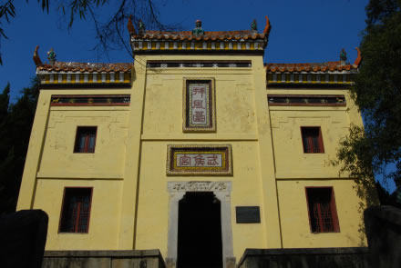又名武侯宮,坐赤壁山東南處的南屏山頂,是為了紀(jì)念在三國演義描述的赤壁之戰(zhàn)中,諸葛武侯在此“設(shè)壇臺、借東風(fēng)、相助周郎”而建造的。整個建筑面積有310平方米,分前后兩殿廟堂,內(nèi)殿供有劉備、關(guān)羽、張飛、諸葛亮的全身塑像,袍帶飄逸,栩栩如生。左側(cè)有文物陳列館,建于1979年,館內(nèi)陳列赤壁出土文物1000余件,有刀、槍、劍、戟、鏃、戈、帶鉤及東吳銅幣(“大錢當(dāng)千”、“大泉五百”、“大泉當(dāng)百”),并有東漢銅鏡和“剪輪五銖”錢及大量東漢、三國時的陶器等。右側(cè)“東風(fēng)閣”于1975年建造,供游人歇憩。今拜風(fēng)臺系1935年重建,1948年維修。