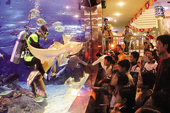 為使都市人品味玩魚樂趣,海底世界專設(shè)玩魚、購魚一條街,令人休閑渡假時陶醉無窮的魚趣之中。 總之,整個園內(nèi)建設(shè)充分體現(xiàn)出現(xiàn)代化、高品位的海洋文化氛圍,是游人開闊眼界、休閑渡假的文化勝地。