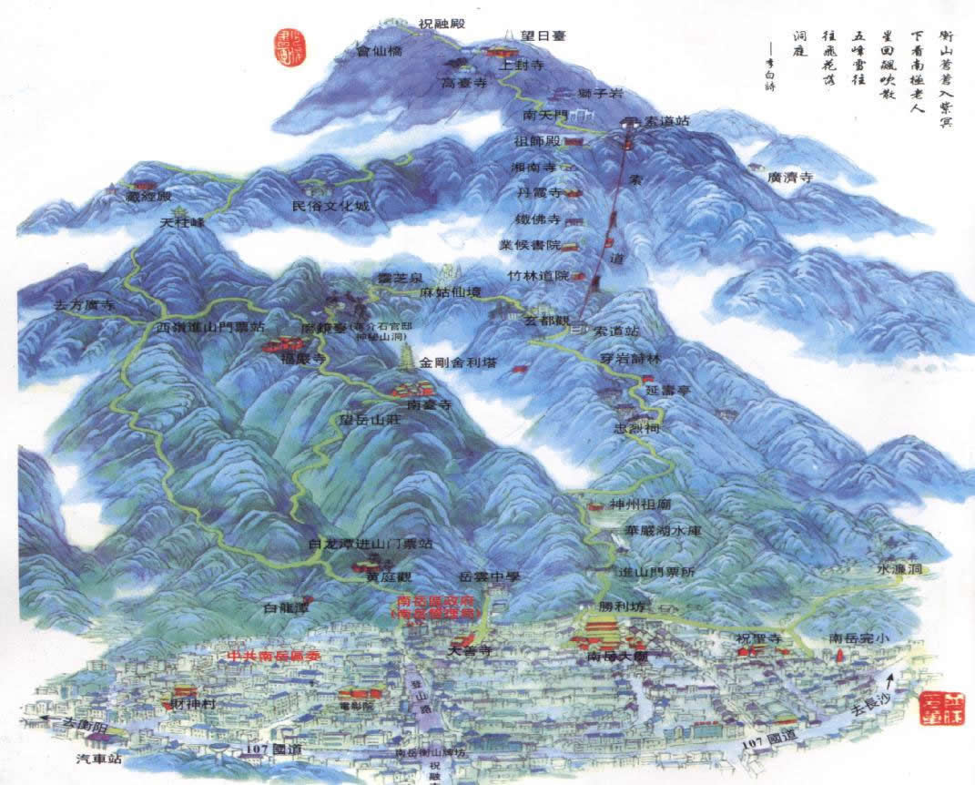 衡陽市南岳衡山旅游區(qū)南距衡陽市中心35千米,屬南岳區(qū)管轄,總面積184平方千米,為國務(wù)院1982年第一批公布的國家重點(diǎn)風(fēng)景名勝區(qū)。有9溪、10橋、24泉、15洞、9池、9潭、38巖等!白H诜逯,藏經(jīng)殿之秀,方廣寺之深,水簾洞之奇”,古稱南岳“四絕”,“麻姑仙境之幽,穿巖詩林之趣,龍鳳飛瀑之雄,禹王古城之古”,是南岳“新四景”。南岳旅游風(fēng)景名勝區(qū)居湘中偏東地區(qū),以主峰祝融為中心,總面積184平方千米。大致分南岳古鎮(zhèn)、水簾洞、忠烈祠、磨鏡臺、祝融峰、藏經(jīng)殿、方廣寺、龍鳳潭8個(gè)游覽區(qū)和西嶺1處避暑區(qū)。