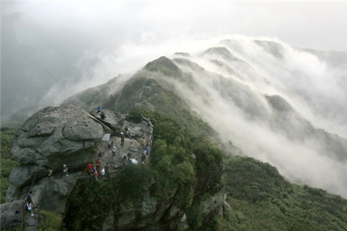 祝融峰是衡山的最高峰,是中國紀(jì)念人文祖先祝融氏的山峰!白H诜逯摺睘槟显里L(fēng)光“四絕”之首。由于常年煙云的烘托和群峰的疊襯,加之它矗立于地勢相對低洼的湘南盆地之中,更顯得它峻極天穹。在古語中“!笔浅志糜肋h(yuǎn)之意,“融”是光明之意,“祝融”是永遠(yuǎn)光明。唐代大文豪韓愈在《游祝融峰》詩中贊嘆道“萬丈祝融拔地起,欲見不見輕煙里”。北宋黃庭堅(jiān)寫道:“萬丈祝融插紫霄,路當(dāng)窮處架仙橋。上觀碧落星辰近,下視紅塵世界遙!贝颂帪閿埲悍,看日出,觀云海,賞雪景的最佳去處。